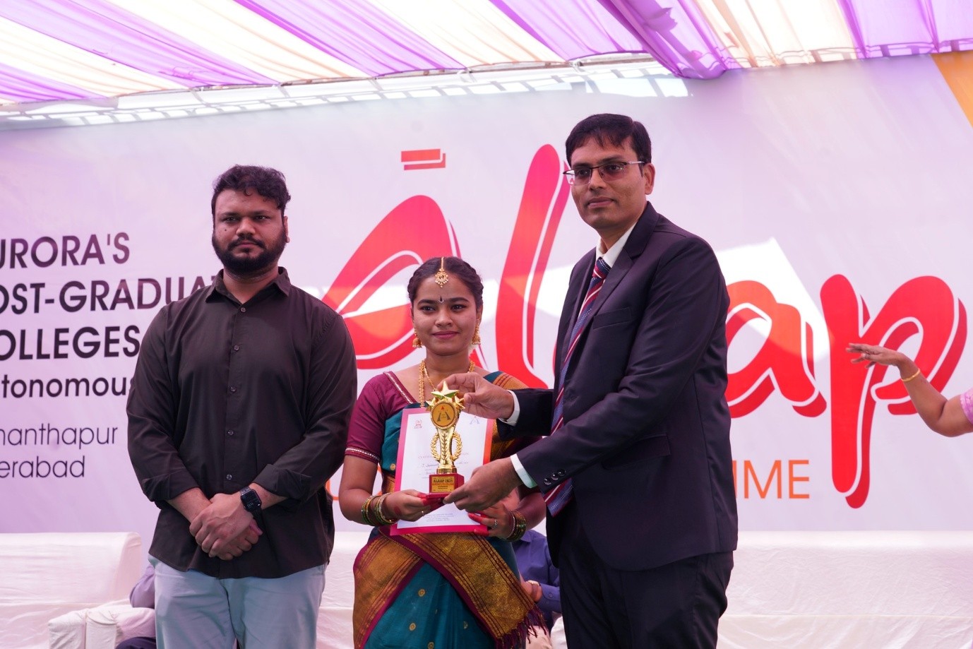 The grandeur of Alaap was accentuated by the presence of distinguished personalities who graced the occasion- Shri Datla Hanumantha Raju Garu, a practising Company Secretary, founder of DHR & Associates, and Chairman of PMC Trust, who shared valuable insights on professionalism, ethics and leadership. Shri V. Raj Kumar, a renowned scientist from DRDL Hyderabad, enlightened students on scientific innovation, curiosity and the importance of research. Dr. N. Ramakrishna Reddy, Deputy Vice President and Zonal Manager of TATA AIG General Insurance, emphasized the importance of risk management and resilience in personal and professional life. Mr. Anudeep Aurora, Chairman of Aurora Group, and Dr. Madhavi Madireddy, Director of Aurora's PG Colleges, provided motivational speeches, emphasizing the importance of lifelong learning and institutional values to the newly joined students.