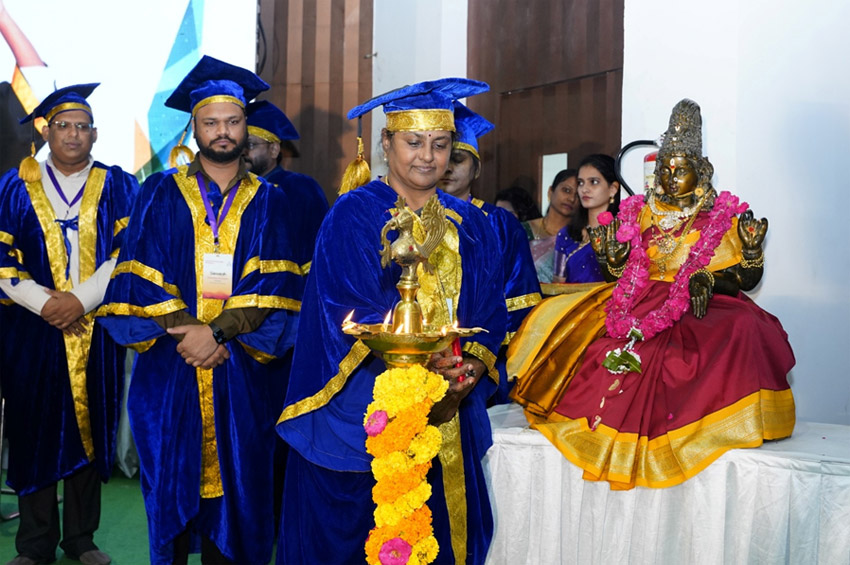 All the events at Aurora commence by offering prayers; and the Convocation Ceremony began with the ‘Lakshmi Narasimha Pancharatnam’, a hymn composed by Jagadguru Adishankaracharya, that symbolizes the shower of divine blessings of strength, protection, prosperity and wisdom. This sacred hymn praises the divine union of Lord Narasimha, the fierce protector of righteousness and Goddess Lakshmi, the embodiment of grace and abundance. Their combined energy represents the balance between courage and compassion, the qualities essential for new graduates stepping into their professional journeys.