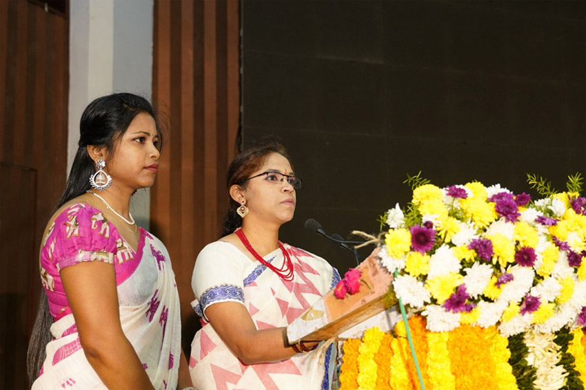All the events at Aurora commence by offering prayers; and the Convocation Ceremony began with the ‘Lakshmi Narasimha Pancharatnam’, a hymn composed by Jagadguru Adishankaracharya, that symbolizes the shower of divine blessings of strength, protection, prosperity and wisdom. This sacred hymn praises the divine union of Lord Narasimha, the fierce protector of righteousness and Goddess Lakshmi, the embodiment of grace and abundance. Their combined energy represents the balance between courage and compassion, the qualities essential for new graduates stepping into their professional journeys.